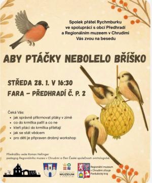 Zveme vás na besedu pořádanou Spolkem přátel Rychmburku, která se uskuteční ve středu 28. ledna 2026 v 16:30 na faře v Předhradí. V průběhu setkání se účastníci dozvědí, jak správně přikrmovat ptáky v zimě, co do krmítka patří a co ne, a které ptáky můžeme v tomto období pozorovat.